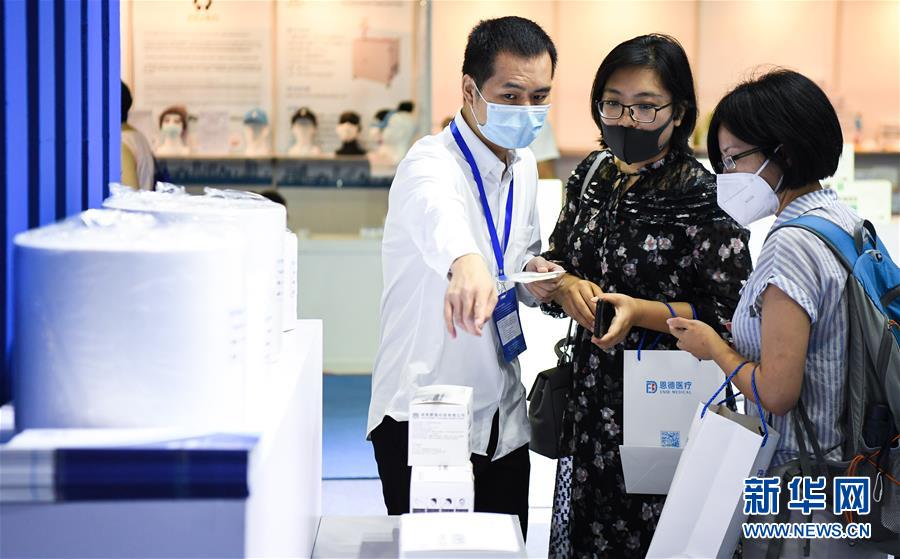 6月10日,一名参展商(左)向采购商讲解口罩生产原料及工艺。当日,广州国际防疫物资展览会在保利世贸博览馆举行。本次展会面积共计3.6万平方米,设有防疫产品、设备、综合服务、原辅料等4个展区,参展企业约600家。新华社记者邓华摄