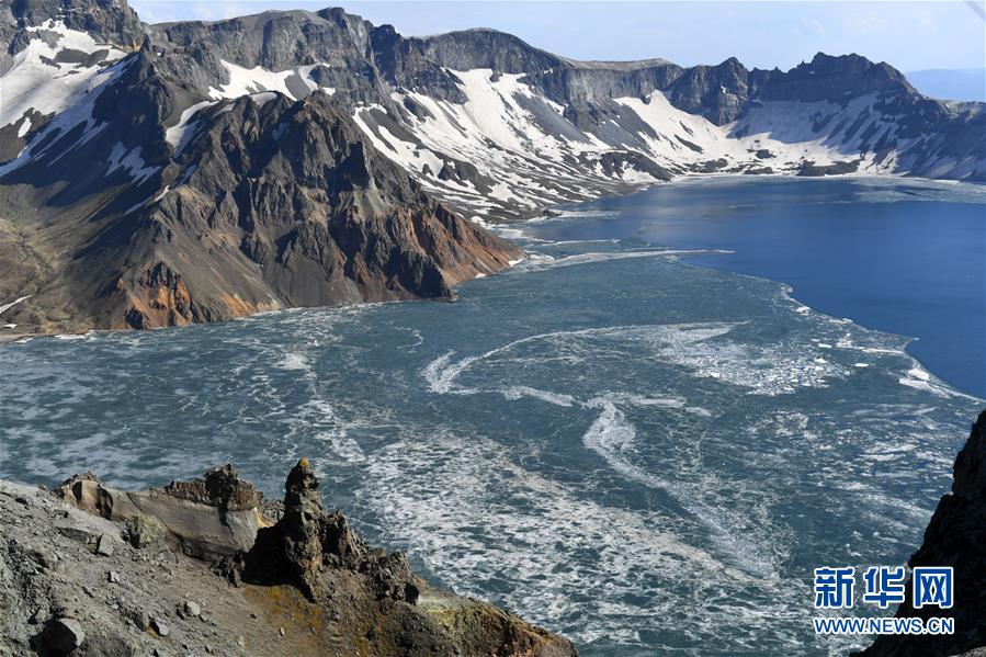 这是6月12日拍摄的长白山天池。近日,长白山天池冰层逐渐消融,迎来“开冰季”。新华社记者 林宏 摄