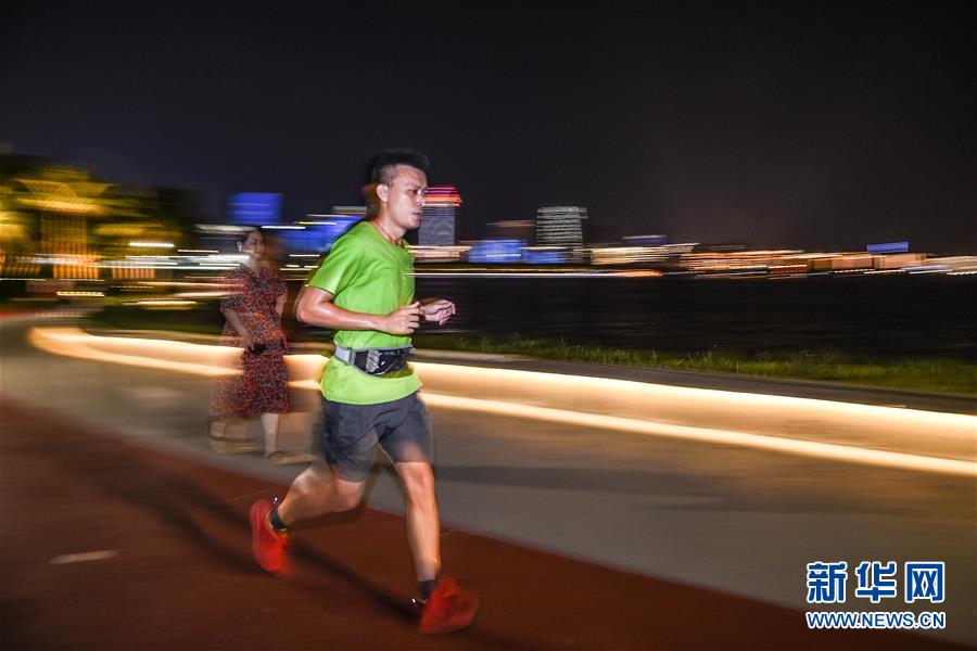 市民在海口万绿园夜跑(5月28日拍摄)。近年来,夜跑成为越来越多都市人热衷的健身方式之一。在海南海口,每当夜幕降临,“夜跑族”来到海口万绿园、世纪公园等夜跑场所跑步,用一身酣畅淋漓的汗水摆脱白天工作中的压力,享受跑步带来的欢愉。新华社记者 蒲晓旭 摄