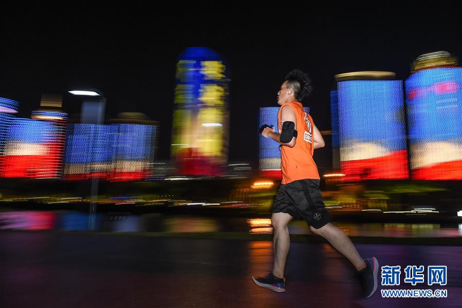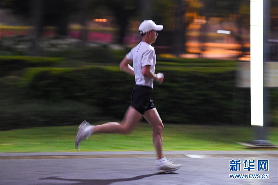一位市民在海口万绿园夜跑(5月28日拍摄)。近年来,夜跑成为越来越多都市人热衷的健身方式之一。在海南海口,每当夜幕降临,“夜跑族”来到海口万绿园、世纪公园等夜跑场所跑步,用一身酣畅淋漓的汗水摆脱白天工作中的压力,享受跑步带来的欢愉。新华社记者 蒲晓旭 摄