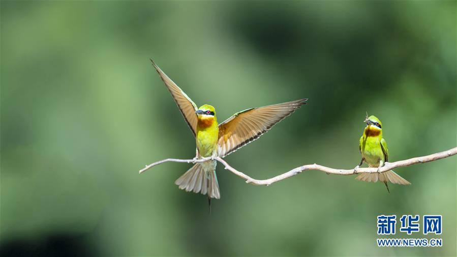 栗喉蜂虎在福建省晋江市深沪镇科任村一山坡上觅食嬉戏(6月12日摄)。入夏以来,逾百只栗喉蜂虎飞临闽南晋江市深沪镇科任村筑巢栖息。新华社记者记者梅永存摄。