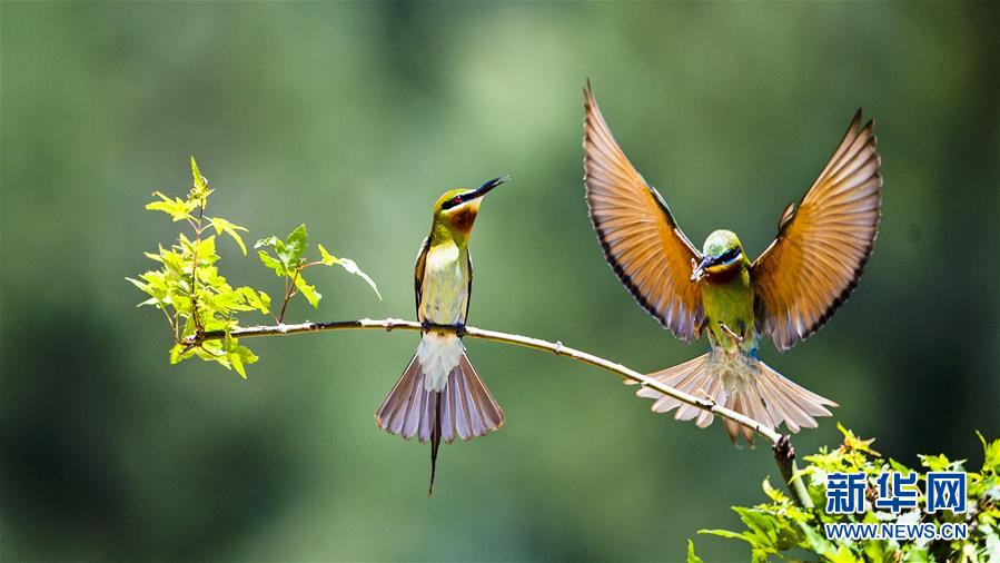栗喉蜂虎在福建省晋江市深沪镇科任村一山坡上觅食嬉戏(6月12日摄)。入夏以来,逾百只栗喉蜂虎飞临闽南晋江市深沪镇科任村筑巢栖息。新华社记者记者梅永存摄。