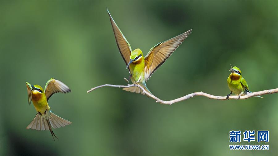 栗喉蜂虎在福建省晋江市深沪镇科任村一山坡上觅食嬉戏(6月12日摄)。入夏以来,逾百只栗喉蜂虎飞临闽南晋江市深沪镇科任村筑巢栖息。新华社记者记者梅永存摄。