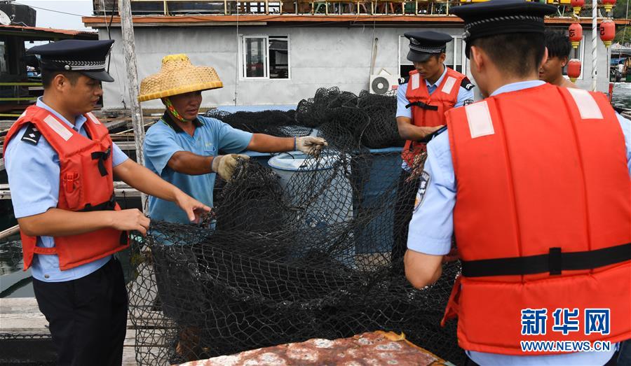 6月13日,海南省公安厅海岸警察总队(筹备组)陵水支队民警帮助辖区内渔民整理渔网。当日,海南省气象局于16时30分继续发布台风四级预警。今年第2号台风“鹦鹉”(热带风暴级)预计于14日在广东沿海登陆。新华社记者杨冠宇摄。