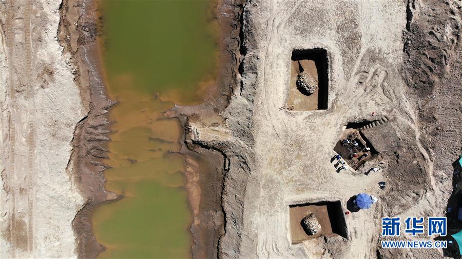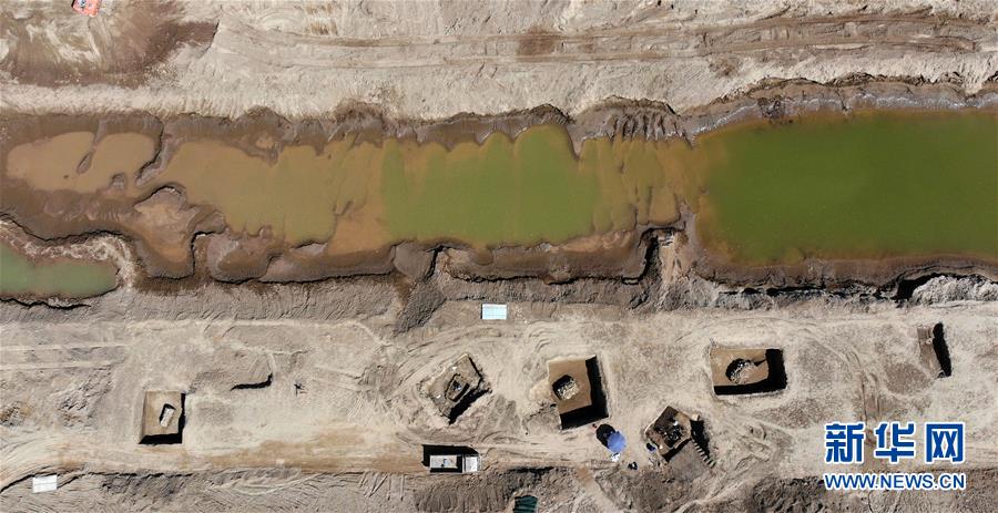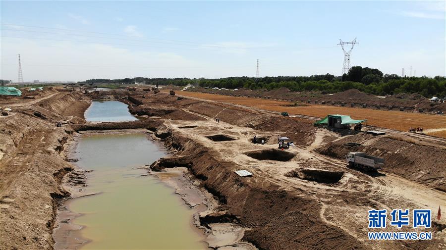 这是6月14日拍摄的山东小清河章丘段考古发掘现场(无人机照片)。近日,济南市考古研究所考古工作队在对小清河章丘段进行考古调查和勘探时,发现了13座年代集中在北朝末期至唐朝初期的古墓。新华社记者 王凯 摄