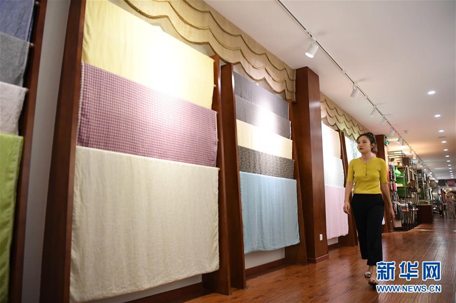 6月12日,天运夏布会馆负责人唐艺在检查展厅内展示的夏布样品。新华社记者 唐奕 摄