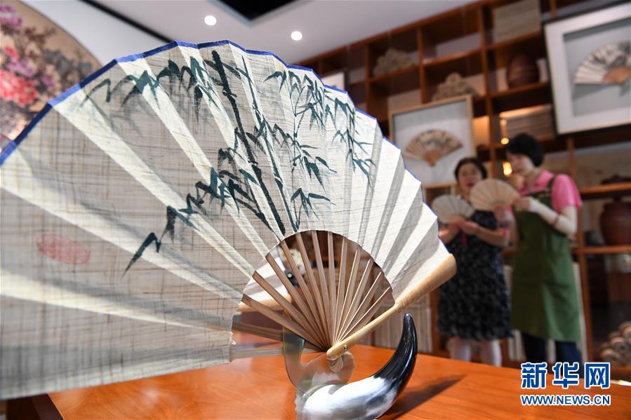 6月12日,非遗传承人马仁芬(左)与马琳沁在探讨夏布折扇的创新设计。新华社记者 唐奕 摄