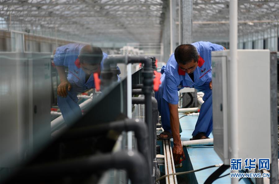 在天津现代晨辉科技集团有限公司的养殖示范场,工人在调试设备(6月15日摄)。新华社记者 李然 摄