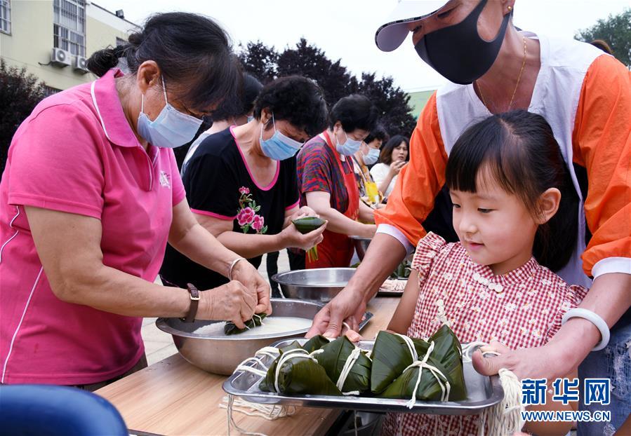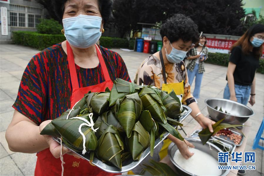 6月17日,水清沟街道居民在社区广场上包粽子。当日,青岛市北区水清沟街道开展迎端午邻里爱心传递进网格活动,居民通过包粽子、吃粽子、网上端午传统文化课等形式传递邻里爱心,传承民俗文化。新华社记者 李紫恒 摄