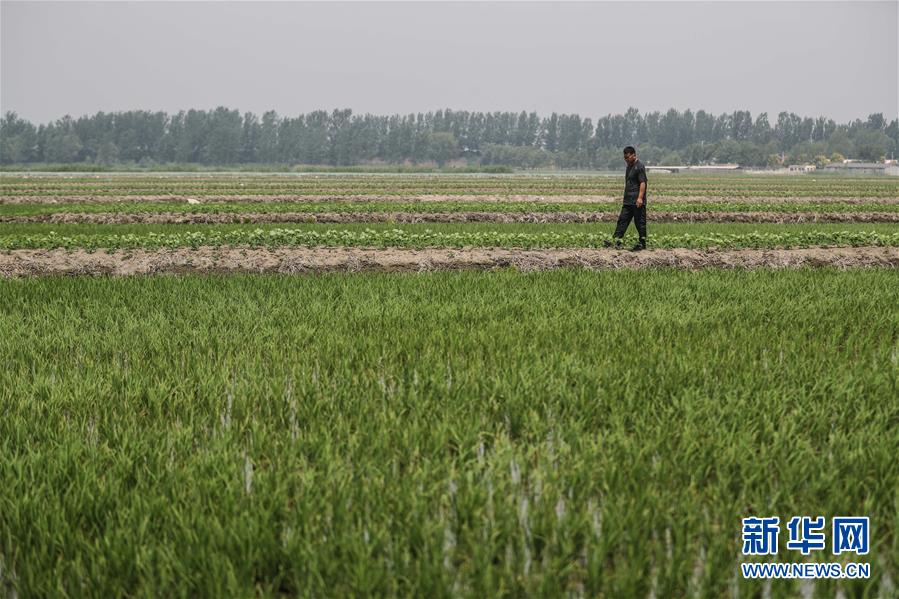 6月17日,农民在盘锦市盘山县太平街道张家村的稻田间查看水稻秧苗生长情况。新华社记者 潘昱龙 摄