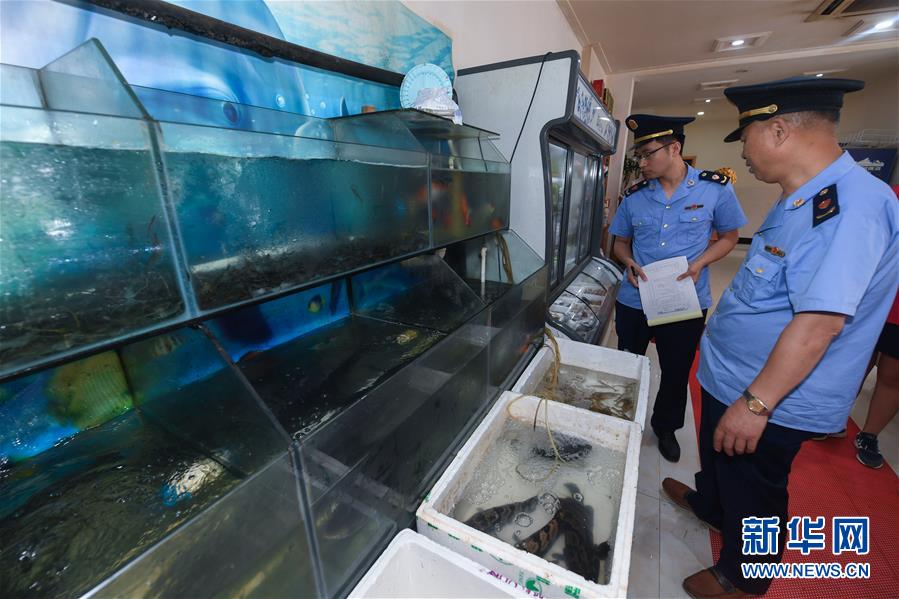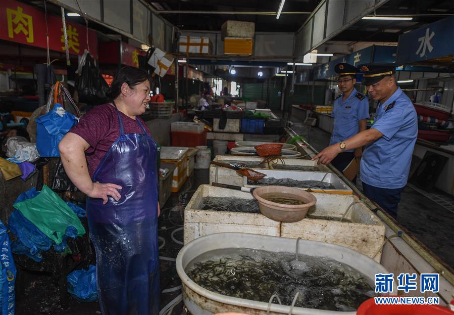 6月17日,市场监管执法人员在东林镇农贸市场开展专项执法行动,检查是否存在非法销售野生动物的情况。新华社记者 徐昱 摄