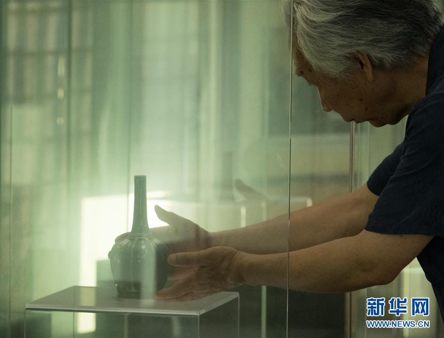 6月17日,在位于浙江慈溪的工作室,闻长庆从展示柜里拿起一件自己烧制的秘色瓷八棱净瓶。新华社记者 翁忻旸 摄