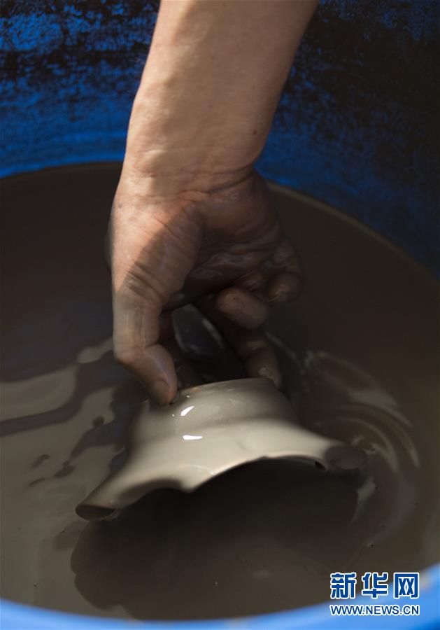 6月17日,在位于浙江慈溪的工作室,闻长庆将一件盏托浸入用本地草木灰调制的釉料中。新华社记者 翁忻旸 摄