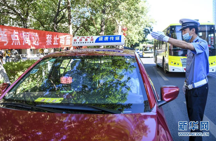 6月20日,在乌鲁木齐市第十一中学门前,乌鲁木齐市公安局交警支队天山区大队新华路中队警官肖健波提醒过往车辆减速慢行、禁止鸣笛。当日,乌鲁木齐市初中升高中考试开始。为保障为期三天的中考顺利进行,乌鲁木齐市公安局交警支队在各考点执勤,为考生保驾护航新华社记者 王菲 摄
