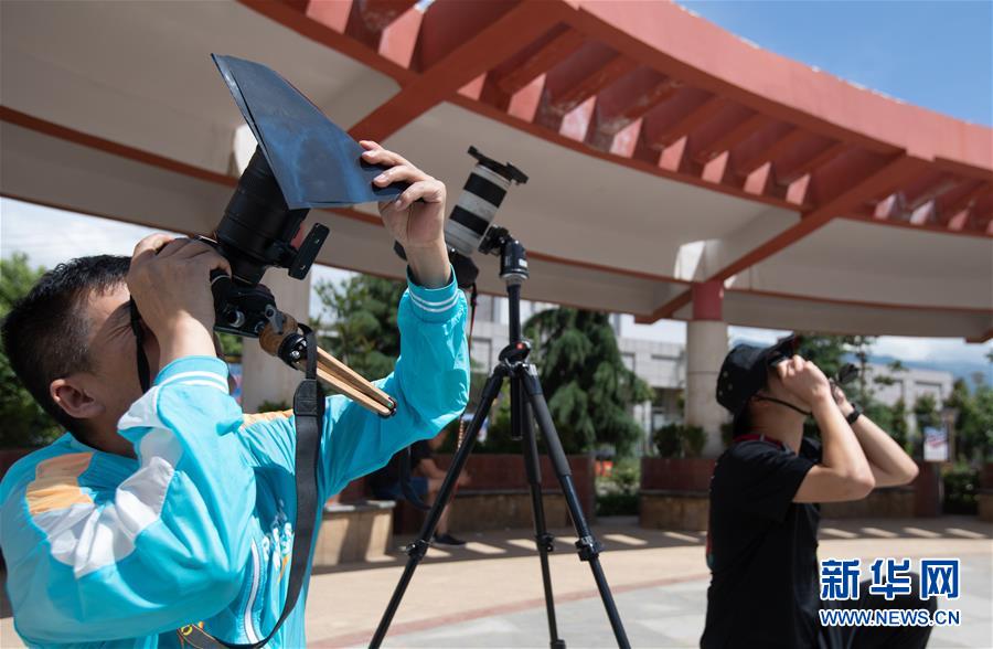 6月21日,在四川省布拖县城,摄影师在拍摄日环食。“日环食”天文景观于6月21日“夏至日”下午在天宇上演。新华社记者 江宏景 摄
