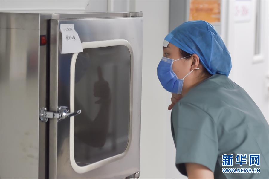 6月19日,在北京地坛医院隔离病房内,护士穿上同事送来的降温马甲后,向同事打招呼感谢。新华社记者彭子洋摄