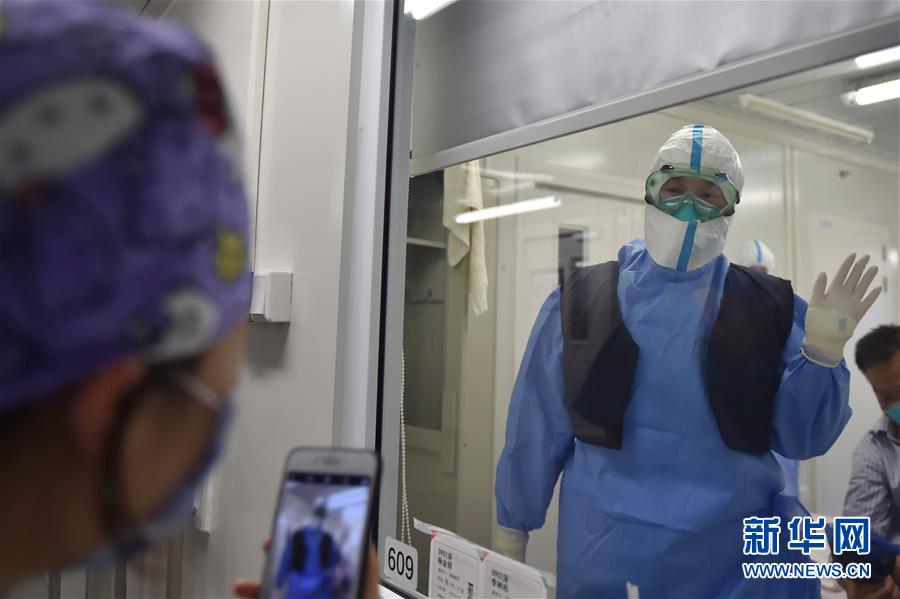 6月19日,在北京地坛医院隔离病房内,护士穿上同事送来的降温马甲后,向同事打招呼感谢。新华社记者彭子洋摄