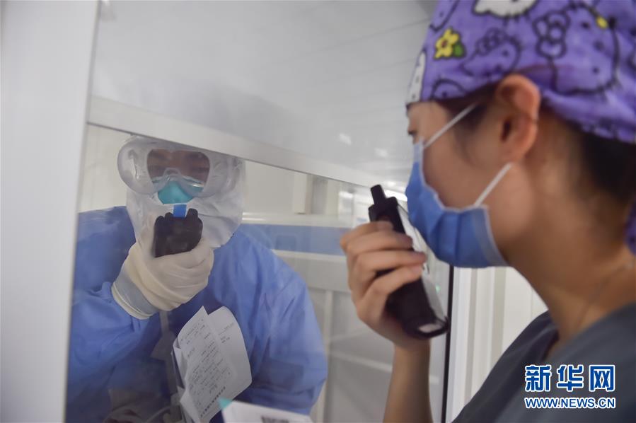 6月19日,在北京地坛医院隔离病区,一名来地坛医院支援的护士(左)在跟地坛医院的护士学习使用对讲机。新华社记者彭子洋摄