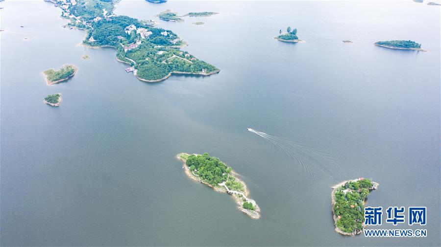 6月21日,游客乘船在红枫湖景区游览(无人机照片)。夏至时节,贵州省清镇市红枫湖景区草木苍翠,秀丽的湖光山色吸引不少游客前来游玩。新华社记者陶亮摄