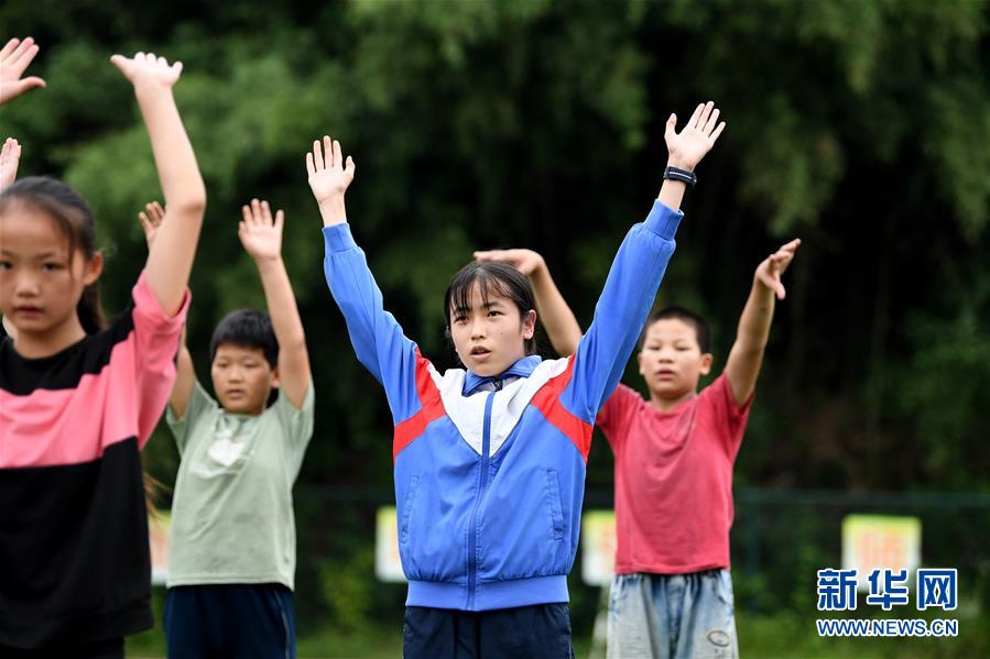 6月19日,在金寨县三合实验学校,蔡齐艳和同学一起上体育课。新华社记者张端摄