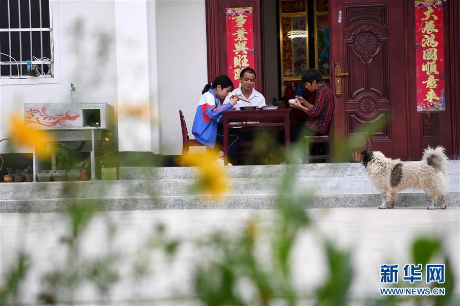 6月19日,在金寨县三合实验学校,蔡齐艳和同学一起吃午饭。新华社记者张端摄