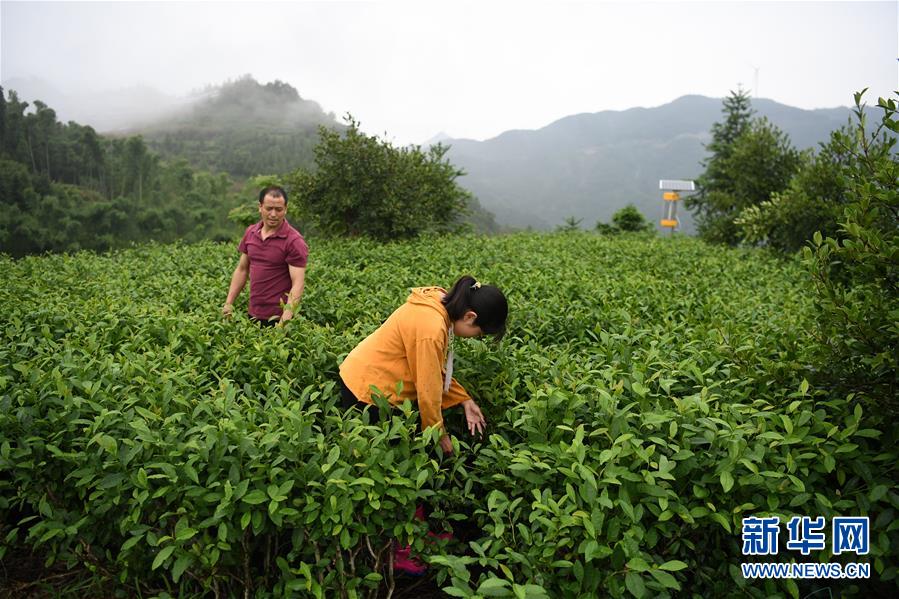 6月20日,蔡齐艳和爸爸蔡守伟在自家茶园里拔草。新华社记者刘军喜摄