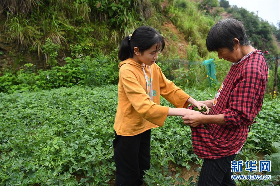 6月20日,蔡齐艳在菜园里帮妈妈傅绍秀采摘蔬菜。新华社记者刘军喜摄