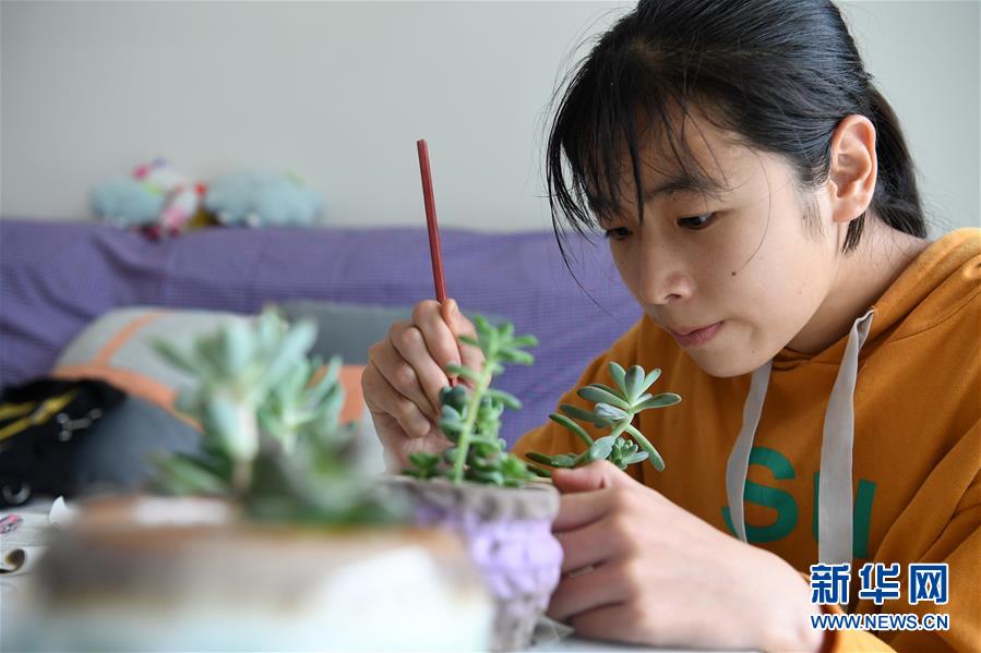 6月20日,蔡齐艳在家中打理多肉植物。新华社记者刘军喜摄