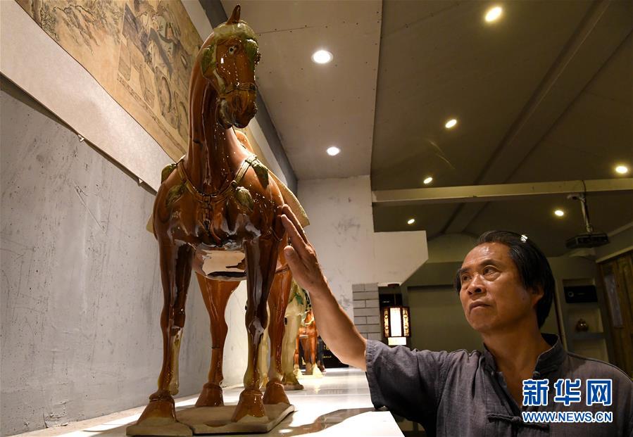 游光明在河南省巩义市站街镇小黄冶村的传习所里查看作品(6月19日摄)。新华社记者李安摄