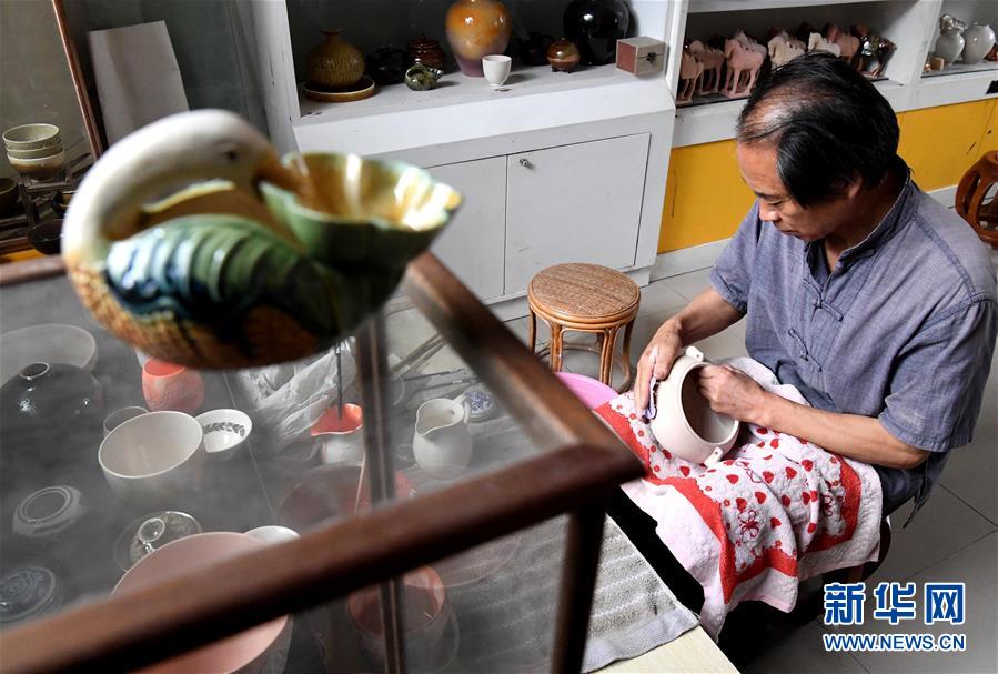 在河南省巩义市站街镇小黄冶村的工作室里,游光明在施釉前对器物进行打磨(6月19日摄)。新华社记者李安摄