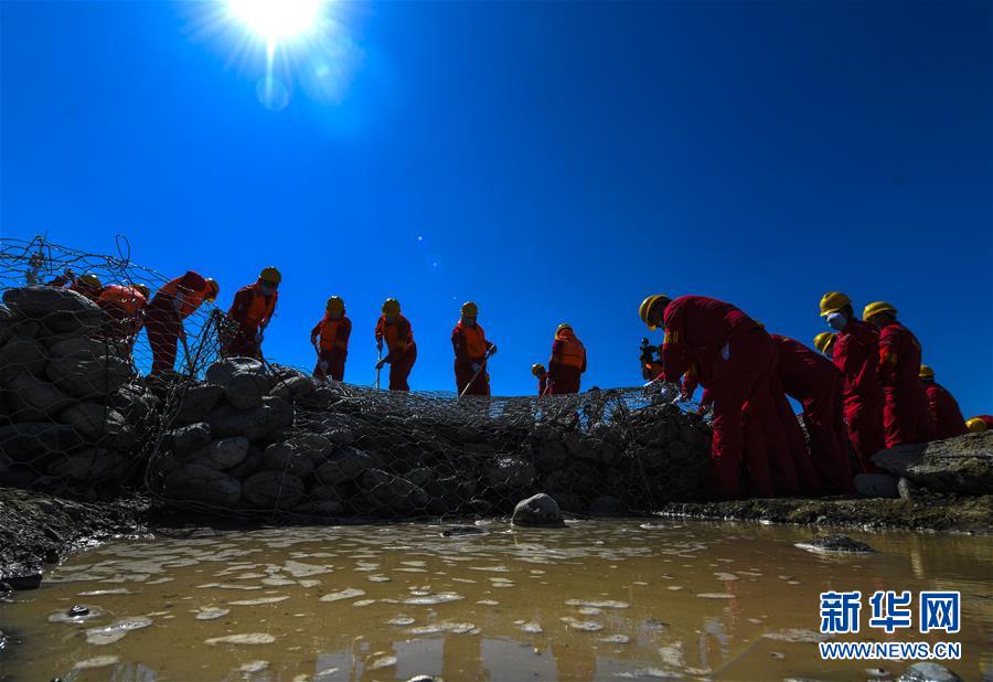 6月22日,应急抢险队员参加演练。当日,新疆维吾尔自治区公路管理局组织的2020年国省干线公路突发地质灾害应急演练在乌鲁木齐举行,演练模拟乌鲁木齐市柴窝堡区域遭受强降雨,诱发附近水域突发洪水,公路路基面临被洪水冲毁的险情,组织抢险人员和机械设备在指定时间内赶赴受灾现场实施应急抢险处置。此次演练将进一步增强各相关部门的防灾减灾意识,提高公路应急抢险处突能力。新华社记者王菲摄