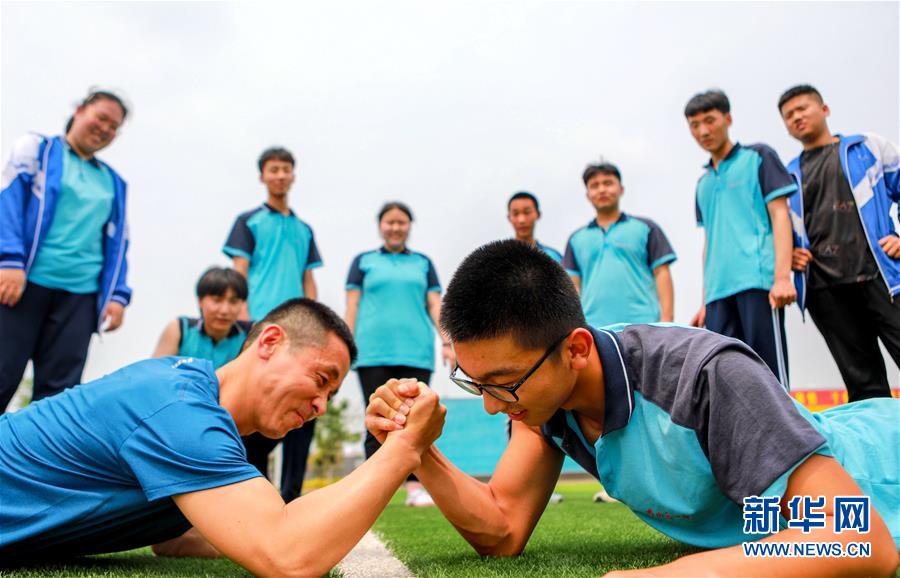 6月22日,河北省邯郸市邯山区第一中学的高三学生和老师进行“掰手腕”游戏。2020年高考临近,河北省邯郸市邯山区第一中学在积极做好高三学生复习备考的同时,开展多种形式的减压活动,帮助学生释放紧张情绪。新华社记者王晓摄