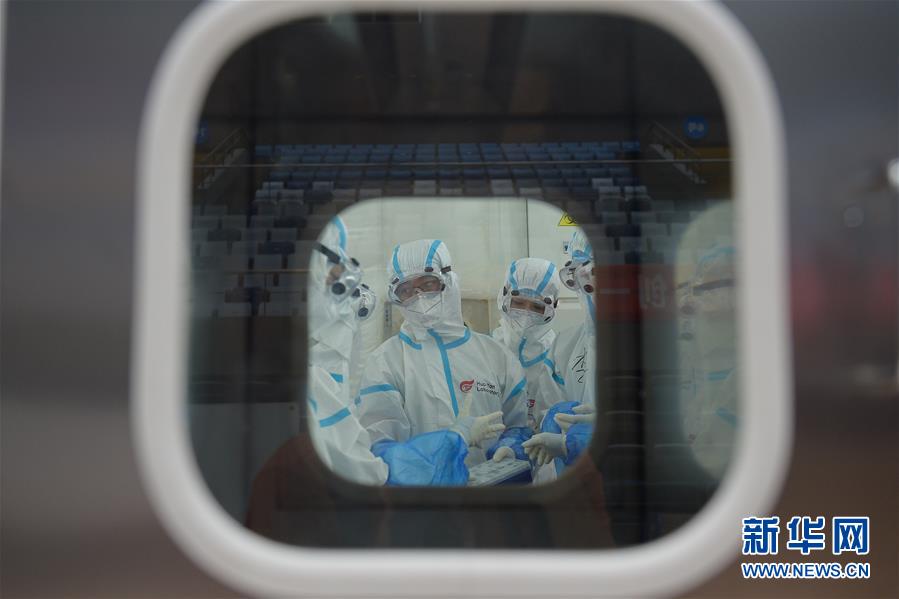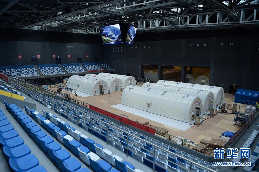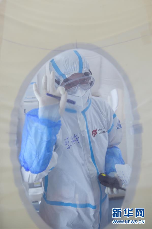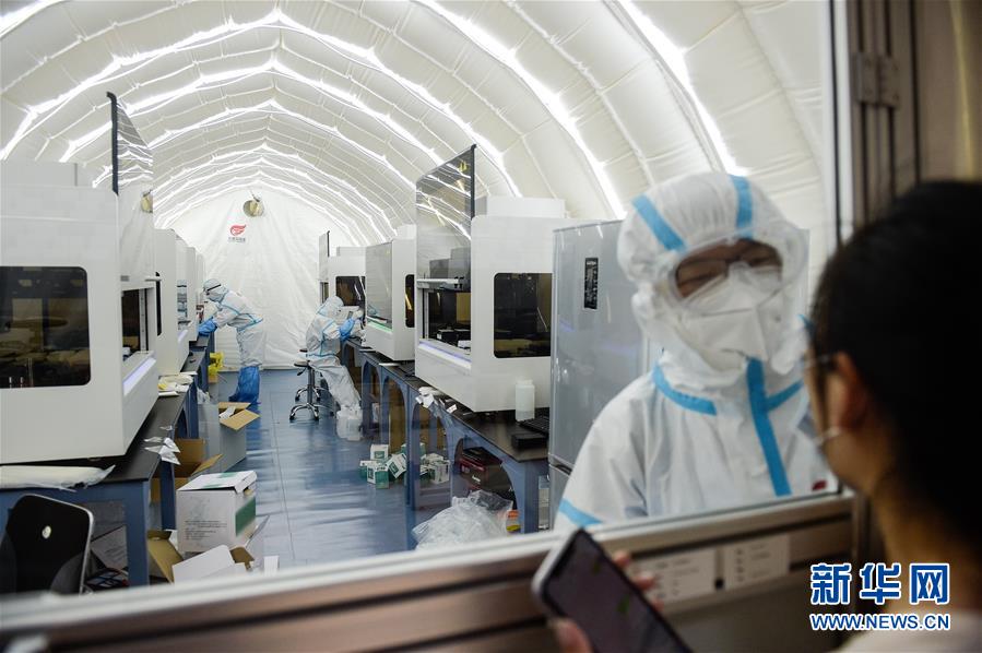 出于北京市疫情防控工作的需要,北京大兴区体育中心综合馆内正在搭建一个可移动、自动化、大通量的核酸检测实验室。目前,工人们正在紧张地进行设备安装和调试。据介绍,气膜版“火眼”核酸检测实验室6月19日下午开始搭建。两天多时间基本上完成了设备安装和调试。9个高3.5米、占地70多平方米的拱形白色气膜舱已搭建完毕,14台自动化核酸提取设备准备就绪。这个北京首座气膜版“火眼”核酸检测实验室正式运转后,实验室核酸检测能力可达到每天上万人份,缓解当前核酸检测压力。新华社记者彭子洋摄