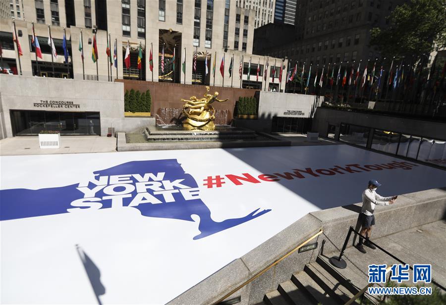 6月22日,在美国纽约洛克菲勒中心,一名男子在写有“纽约坚强”字样的广场自拍。美国约翰斯·霍普金斯大学22日发布的新冠疫情最新统计数据显示,美国累计死亡病例超过12万例。新华社记者王迎摄