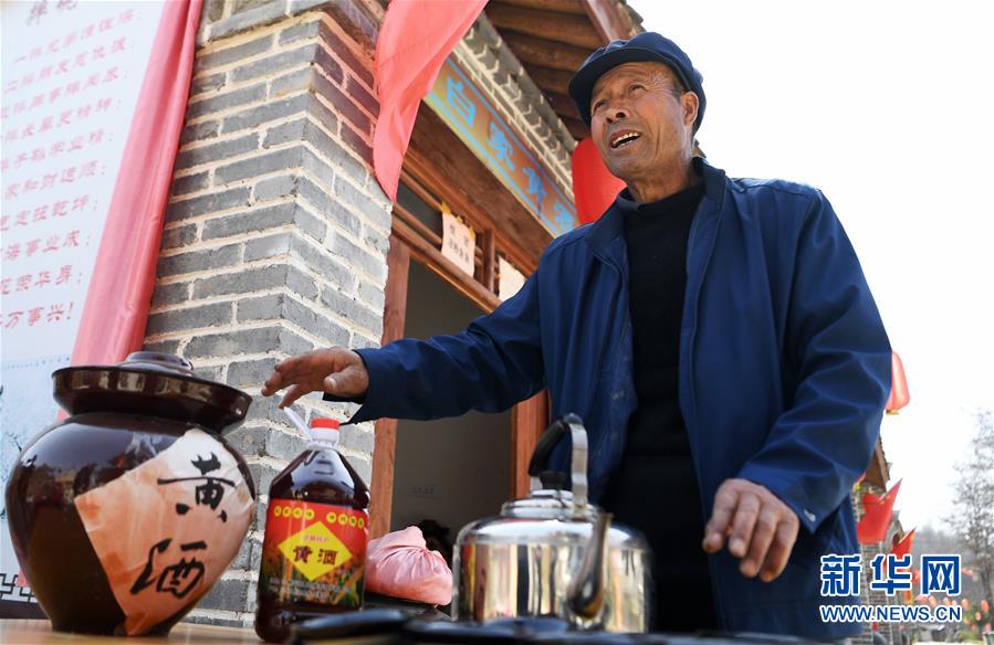 甘肃省平凉市泾川县泾明乡白家村村民白贵元在自家黄酒铺前张罗生意(3月19日摄)。新华社记者陈斌摄