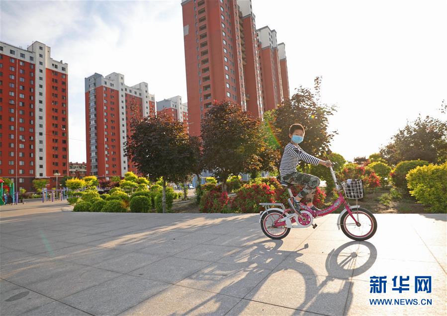 一名小朋友在辽宁省辽阳市辽阳县刘二堡镇前杜村居民小区内骑自行车玩耍(6月1日摄)。新华社记者杨青摄
