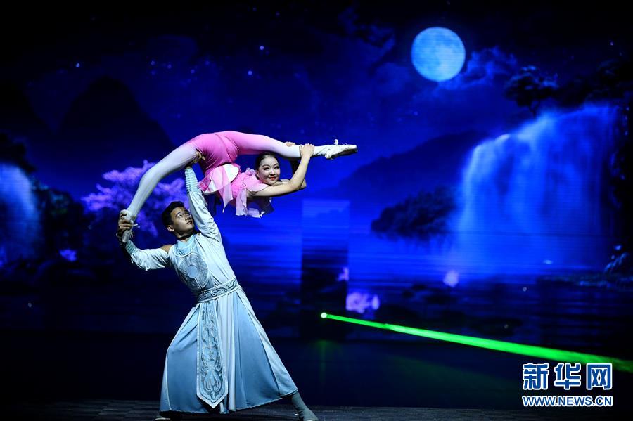 6月22日拍摄的《西安千古情》演出现场。大型舞台剧《西安千古情》22日在西安浐灞世博园首演。该剧以一位华裔少女归国寻根为故事主线,浓缩展现了古城西安的悠久历史文化。新华社记者张博文摄