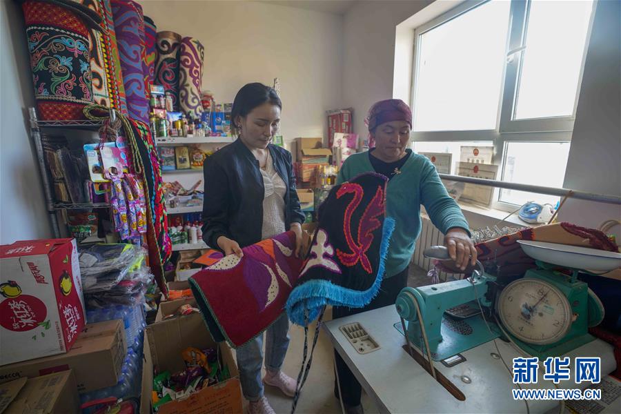 在吉木乃县万驼园内,古丽丁·米拉木别克(左)和母亲在自家的超市里整理商品(6月21日摄)。新华社记者赵戈摄