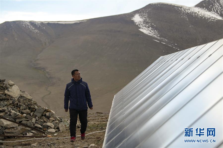 在中国科学院新疆天文台慕士塔格观测站,冯国杰检查太阳能光伏电板的运行情况(6月15日摄)。新华社记者胡虎虎摄