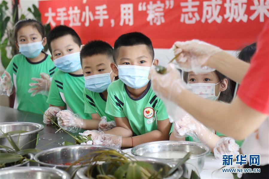 6月24日,在河北省廊坊市安次区西小街社区活动中心,孩子们学习包粽子。端午节临近,各地举行包粽子、做香包、赛龙舟等丰富多彩的民俗文化活动,迎接传统佳节的到来。新华社记者王晓摄