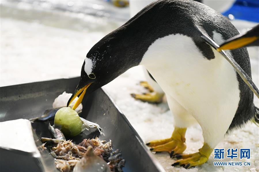 6月24日,哈尔滨极地馆的企鹅在享用工作人员送来的美食。当日,哈尔滨极地馆的工作人员特地准备了“鱼粽”“肉粽”,让生活在这里的极地动物也品尝一下端午美食。新华社记者王建威摄