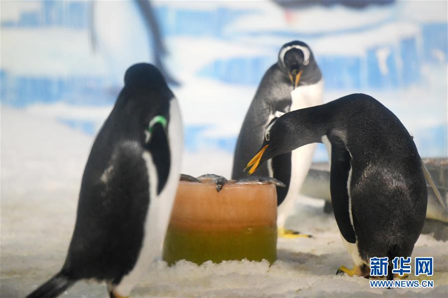 6月24日,哈尔滨极地馆的企鹅在品尝“鱼粽”里的小鱼。当日,哈尔滨极地馆的工作人员特地准备了“鱼粽”“肉粽”,让生活在这里的极地动物也品尝一下端午美食。新华社记者王建威摄