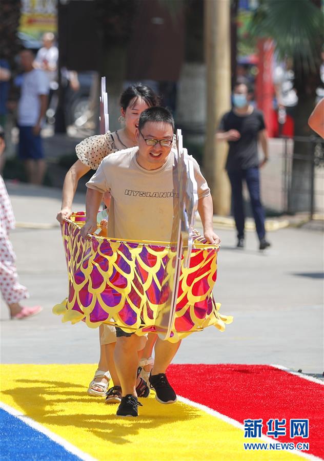 6月25日,在重庆市涪陵区美心红酒小镇举办的端午传统民俗体验活动中,市民参加“旱地龙舟”比赛。新华社记者 黄伟 摄