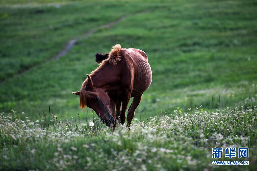 一匹马在新疆喀纳斯景区内吃草(6月24日摄)。新华社记者 沙达提 摄