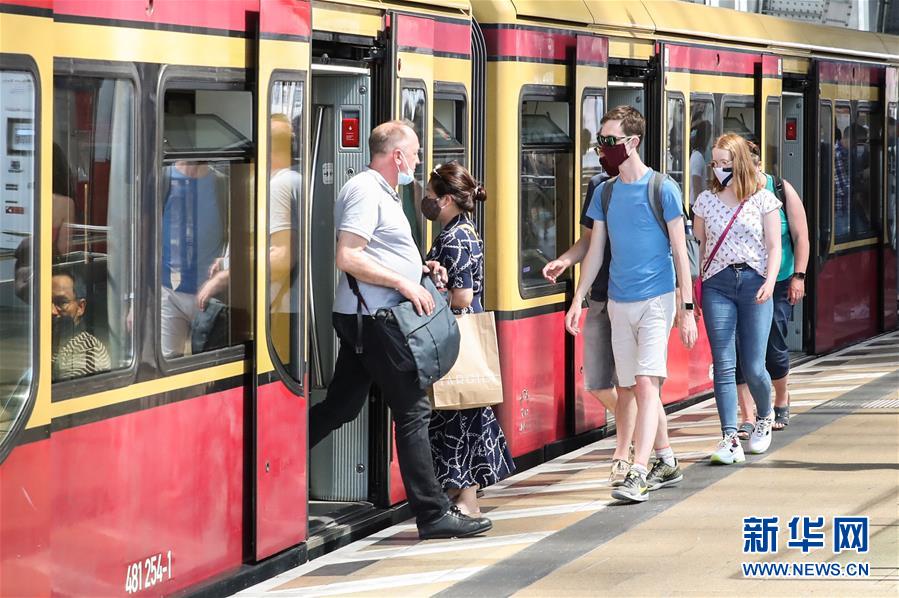 6月27日,在德国首都柏林,戴口罩的乘客出入一列城市快铁列车。