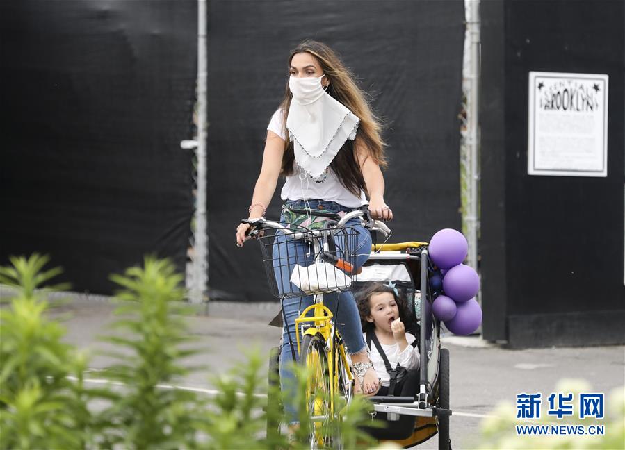 6月27日,一名女士在美国纽约多米诺公园内骑车带孩子游玩。美国约翰斯·霍普金斯大学27日发布的新冠疫情最新统计数据显示,截至美国东部时间27日16时35分(北京时间28日4时35分),美国累计新冠确诊病例2500419例,累计死亡病例125434例。新华社记者王迎摄