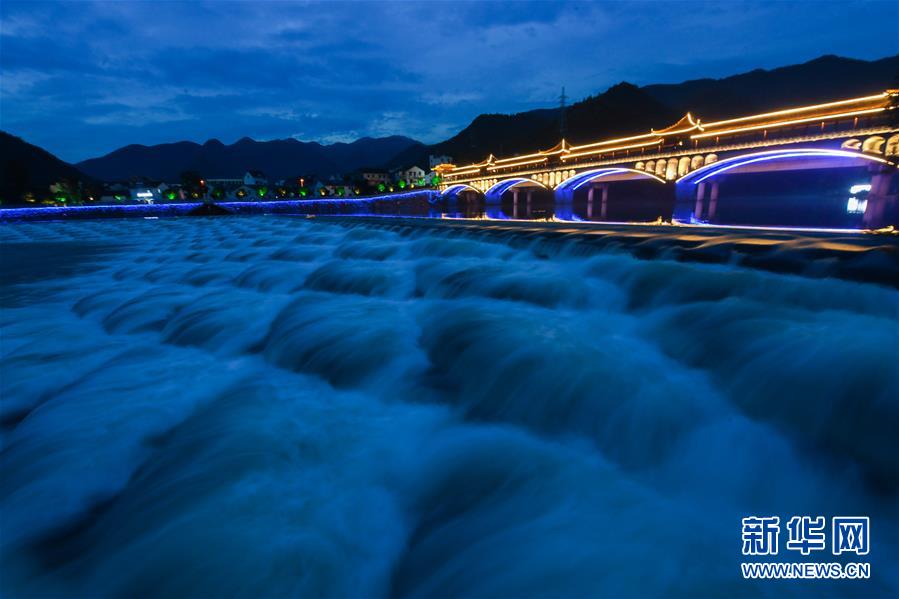 6月27日拍摄的夜色中的杭州市富阳区湖源乡龙鳞坝。近期,浙江省杭州市富阳区场口镇、常安镇和湖源乡组团开启了一场夏季“绿水青山嘉年华”。这几个壶源溪流域乡镇整合生态旅游资源,组团开发山村旅游项目,游客可以参与壶源溪水上游乐、露营永安山顶、特色农产品集市和瓜果节等特色活动。新华社记者徐昱摄