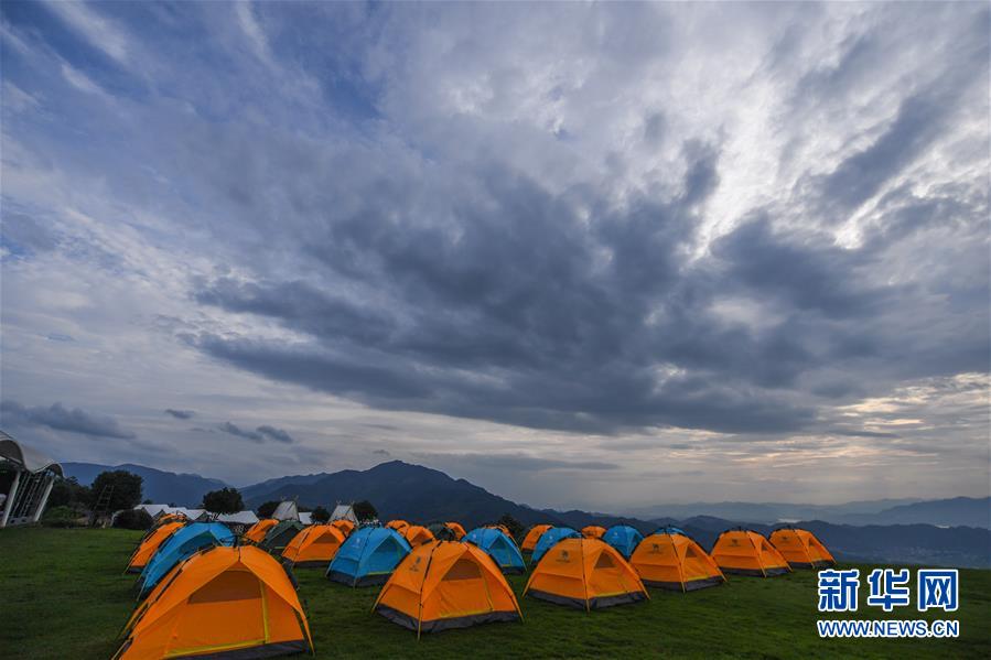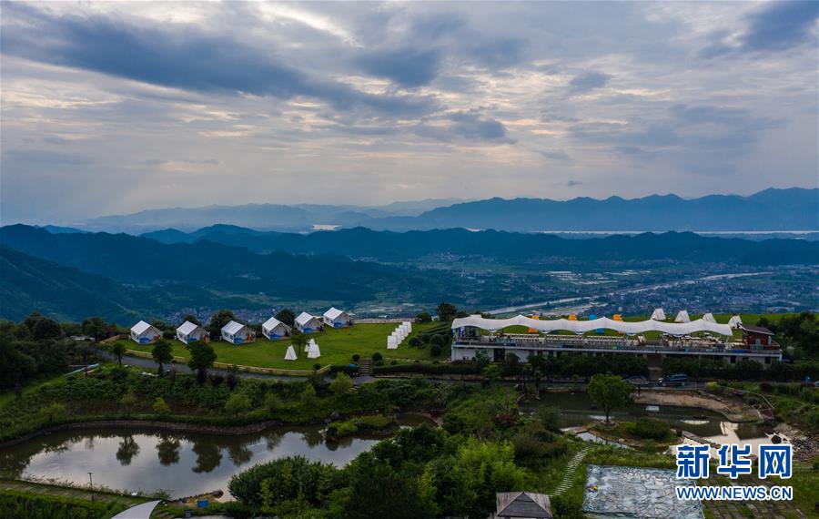 6月27日在杭州市富阳区常安镇永安山顶拍摄的帐篷酒店。近期,浙江省杭州市富阳区场口镇、常安镇和湖源乡组团开启了一场夏季“绿水青山嘉年华”。这几个壶源溪流域乡镇整合生态旅游资源,组团开发山村旅游项目,游客可以参与壶源溪水上游乐、露营永安山顶、特色农产品集市和瓜果节等特色活动。新华社记者徐昱摄