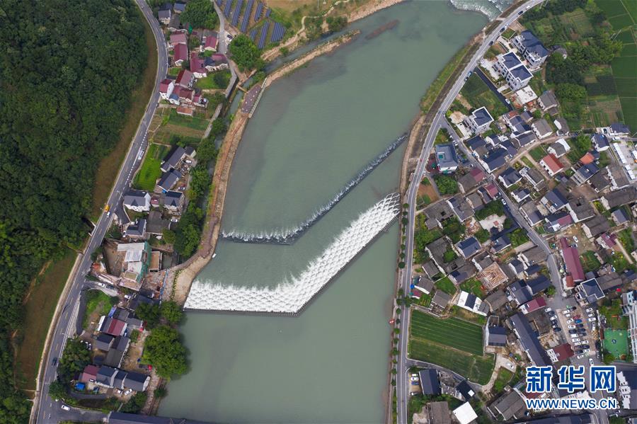 空中俯瞰杭州市富阳区湖源乡的龙鳞坝(6月28日摄,无人机照片)。近期,浙江省杭州市富阳区场口镇、常安镇和湖源乡组团开启了一场夏季“绿水青山嘉年华”。这几个壶源溪流域乡镇整合生态旅游资源,组团开发山村旅游项目,游客可以参与壶源溪水上游乐、露营永安山顶、特色农产品集市和瓜果节等特色活动。新华社记者徐昱摄