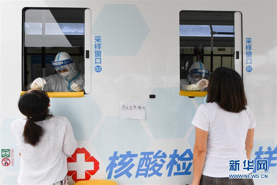 6月28日,在北京市西城区北京展览馆南侧的露天广场核酸检测采样点,核酸检测采样车内的医护人员为前来做检测的人员进行采样。新华社记者鞠焕宗摄